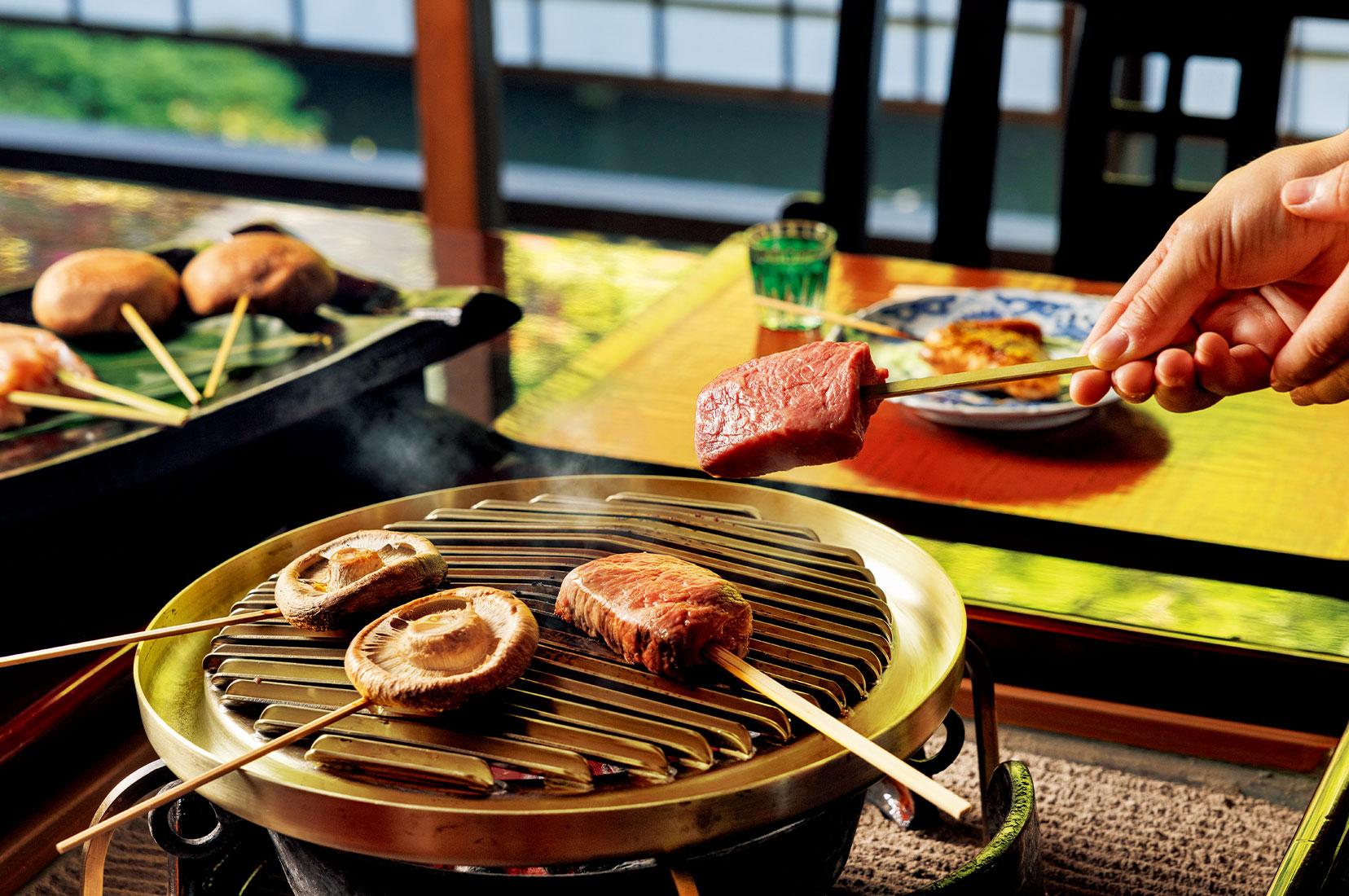 歴史のある食を楽しむことができるのも、高尾山の魅力のひとつ。国内外に22店舗のレストランを経営するUKAIが産声を上げたのも高尾だった。1964年、創業者の鵜飼貞男氏が高尾に300坪の土地を求め、「100年続く店づくりを」という理念のもとスタートしたのが「うかい鳥山」だ。現在は6000坪という広大な敷地に、大小約40棟が点在。旬の食材を用いた料理が供される。おすすめは「牛鶏コース」。牛串・鶏串の炭火焼に、季節の前菜や川魚、麦とろごはんなどが付く。訪れた人は川のせせらぎと鳥の声をBGMに、四季折々の風情を肌で感じることができる。「目覚ましく変わる東京を横目に、鵜飼は“古きよきものを残す”という使命を遂行していたように思います。敷地の入り口に立つ合掌造りは、地元の方々のお力も拝借し、1968年に越中五箇山から移築したもの。そうした人と人のつながりを重要だと考えていました。お客様に“本物”をご提供することに多くを費やしていたように思います」と、創業者の薫陶を受けた支配人・大神田一徳氏は語る。