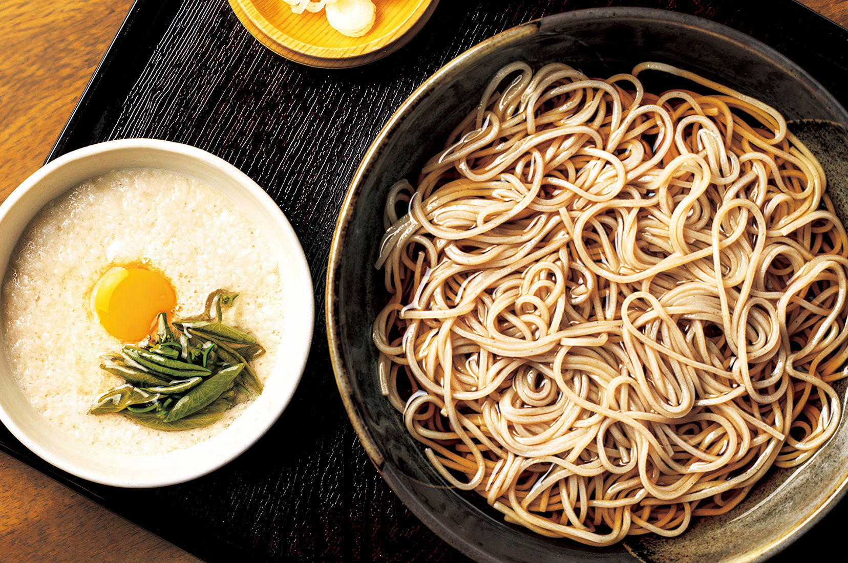 麺は蕎麦粉6割をとろろ芋と上質粉で練り上げた細め。とろろは大和芋のねばりと、長芋のとろみを同割で合わせている。昔から高尾山にとろろ蕎麦の店が多いのは、山を登る参拝者に対し、滋養のつくものを食べさせるためだったというのがその理由。「最近は海外の方も、上手にお箸を使ってとろろ蕎麦を召し上がっています」と髙橋氏。温かいとろろ蕎麦にはとんぶり、冷たいとろろ蕎麦にはじゅんさいが入り、食感に変化を添えている。